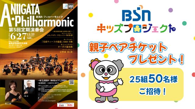 必要事項をご記入の上、下部にある「確認画面へ」ボタンを押してください。 必要事項をご確認の上、下部にある「送信する」ボタンを押してください。 『新潟A・フィルハーモニック 第5回定期演奏会』抽選でペア25組50名様をご招待!抽選で25組50名様に『新潟A・フィルハーモニック 第5回定期演奏会』親子ペアチケットをプレゼント! ◆日時◆ 2026年6月27日(土)14:30開演(13:50開場) ◆会場◆ りゅーとぴあ 新潟市芸術文化会館 コンサートホール ◆対象◆ 小学校1年生から18歳以下の方と付き添いの方、ペア25組50名様をご招待! ※ペアの席は並びの席です。 ※未就学児は入場できませんので、ご了承ください。 ※お申し込みは、お一人様1回に限らせていただきます。 ※当選された方には、6月5日(金)までにチケットを郵送いたします。 (発送をもって発表と代えさせていただきます) ◆応募締切◆ 2026年5月31日(日)12時00分まで 詳しくはこちらから郵便番号(必須)ご住所(必須) 北海道 青森県 岩手県 宮城県 秋田県 山形県 福島県 茨城県 栃木県 群馬県 埼玉県 千葉県 東京都 神奈川県 新潟県 富山県 石川県 福井県 山梨県 長野県 岐阜県 静岡県 愛知県 三重県 滋賀県 京都府 大阪府 兵庫県 奈良県 和歌山県 鳥取県 島根県 岡山県 広島県 山口県 徳島県 香川県 愛媛県 高知県 福岡県 佐賀県 長崎県 熊本県 大分県 宮崎県 鹿児島県 沖縄県 市町村 新潟市 長岡市 三条市 柏崎市 新発田市 小千谷市 加茂市 十日町市 見附市 村上市 燕市 糸魚川市 妙高市 五泉市 上越市 阿賀野市 佐渡市 魚沼市 南魚沼市 胎内市 聖籠町 弥彦村 田上町 阿賀町 出雲崎町 湯沢町 津南町 刈羽村 関川村 粟島浦村 氏名(必須)年齢(必須)0歳1歳2歳3歳4歳5歳6歳7歳8歳9歳10歳11歳12歳13歳14歳15歳16歳17歳18歳19歳20歳21歳22歳23歳24歳25歳26歳27歳28歳29歳30歳31歳32歳33歳34歳35歳36歳37歳38歳39歳40歳41歳42歳43歳44歳45歳46歳47歳48歳49歳50歳51歳52歳53歳54歳55歳56歳57歳58歳59歳60歳61歳62歳63歳64歳65歳66歳67歳68歳69歳70歳71歳72歳73歳74歳75歳76歳77歳78歳79歳80歳81歳82歳83歳84歳85歳86歳87歳88歳89歳90歳91歳92歳93歳94歳95歳96歳97歳98歳99歳100歳101歳102歳103歳104歳105歳106歳107歳108歳109歳110歳111歳112歳113歳114歳115歳116歳117歳118歳119歳120歳121歳122歳123歳124歳125歳性別(任意) 男性 女性 無回答 メールアドレス(必須)電話番号(必須) 利用規約 投稿できる動画や写真は、投稿者自らが撮影したものに限ります。 投稿者の個人情報は、新潟放送個人情報保護方針に従って適切に取り扱います。 投稿された動画や写真の著作権は投稿者にありますが、投稿者は、新潟放送及びJNN系列各局に対して、その利用及び真実性を損なわない範囲での加工・編集等を、期間の定めなく、かつ、無償で許諾したものとみなします。 新潟放送及びJNN系列各局は、これを放送(地上波、BS、CS、CATV、移動体向け、海外を含みますが、これに限りません)のほか、インターネット、SNS、DVD等での2次利用、出版物、チラシ、ポスター、イベント等で利用する場合があります。 「BSNスクープ投稿」、「企画投稿」のシステムが終了した後であっても、新潟放送及びJNN系列各局は、本利用規約に従い、投稿された動画や写真を利用できるものとします。 投稿された動画や写真については、その削除あるいは返送に応じることはできません。 投稿の際の通信料は投稿者のご負担となります。通信料が高額になることがあるため通信会社のパケット定額制度を利用されることをお勧めします。 投稿された動画や写真について新潟放送及びJNN各局から問い合わせさせていただくことがあります。 投稿された動画や写真の採否は新潟放送及びJNN系列各局の裁量によるものとし、また、採否の基準等についてのお問い合わせに応じることはできません。 放送にあたっては、投稿者のご同意を得たうえで投稿者のお名前等を表示する場合があります。 刑事事件・事故などに関わるものを除き、著作権その他の財産権、プライバシー、肖像権など第三者の権利を侵害するおそれのあるものは投稿してはいけません。また、投稿者は、不正や虚偽の情報を投稿してはいけません。 本利用規約の趣旨に反して「BSNスクープ投稿」、「企画投稿」を利用したり、不正にアクセスすることを禁じます。 本利用規約に反した行為により新潟放送あるいはJNN系列各局に損害を与えたときは、これにより蒙った一切の損害(弁護士費用を含む)を賠償していただきます。 新潟放送は、投稿された動画や写真を保存・保管する義務を負わず、理由の如何を問わずデータの消失あるいは削除について責任を負いません。 新潟放送は予告なく「BSNスクープ投稿」、「企画投稿」を停止し、あるいは廃止できるものとします。また、通信設備その他の理由によりシステムが停止し、あるいはアクセスできないことがあるものとします。これらにより仮に投稿者に何らかの損害が生じたとしても、新潟放送は一切の責任を負わないものとします。 「企画投稿」で動画や写真を投稿する場合で、被写体にキャラクタ